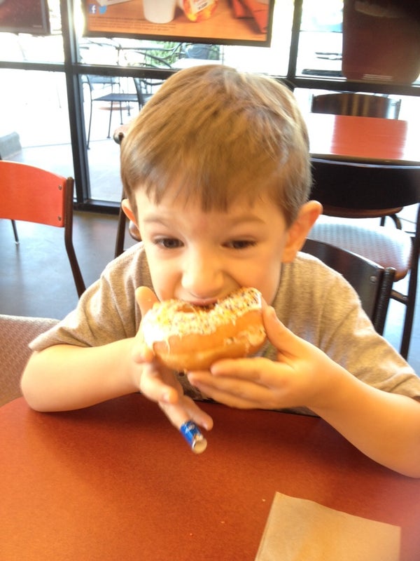 Try the Monkey C Monkey Do donut. Banana creme, chocolate icing & crumbled Reese's Peanut Butter Cup on top. Yum! -Tina